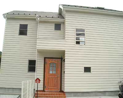 M邸を正面玄関から見たところで。 シンプルでクリアーな住宅は住む人の人柄をも表すようです。 玄関ドアはムク材の玄関ドアを使用しおります。 |
